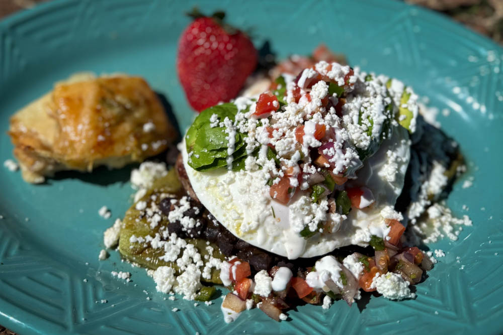 Grilled cactus paddle topped with six ounces of grilled flank steak, black beans, two fried eggs, Pico de Gallo, sliced avocado, cream fresca, and queso fresco. Served with green chili potatoes | $18